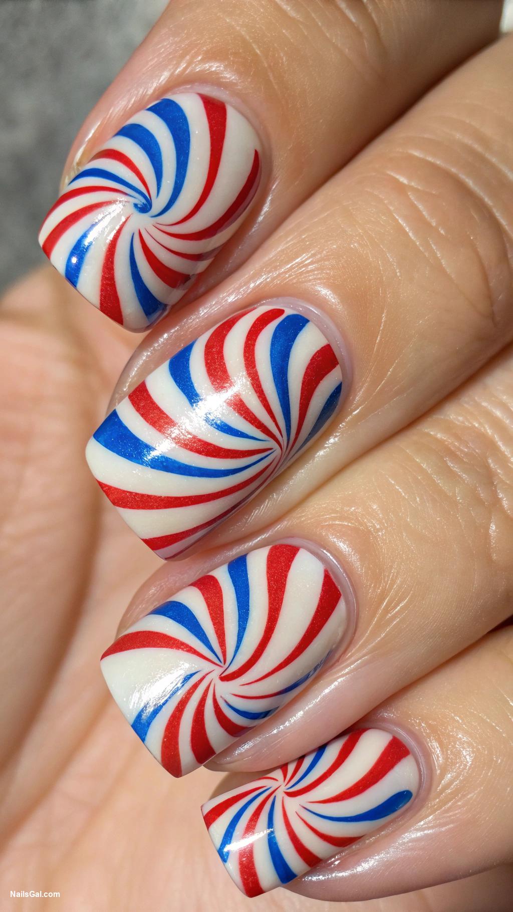 Patriotic Spirals: Spiraled Designs Mixing Red, White, and Blue Around a Nude Base for a Unique Effect.